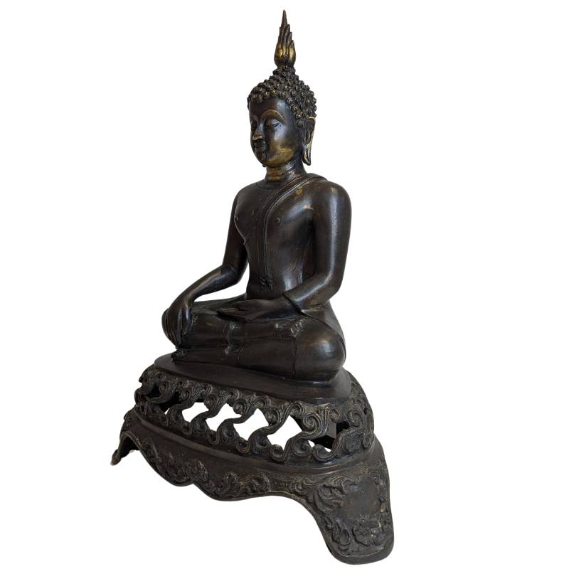 Eine sitzende Buddha-Statue aus Bronze zeigt die rechte Hand in der Bhumisparsha-Mudra (Erdberührung) und die linke Hand mit der Handfläche nach oben im Schoß. Diese Pose symbolisiert den Moment der Erleuchtung und ist charakteristisch für die südostasiatische buddhistische Bildtradition.